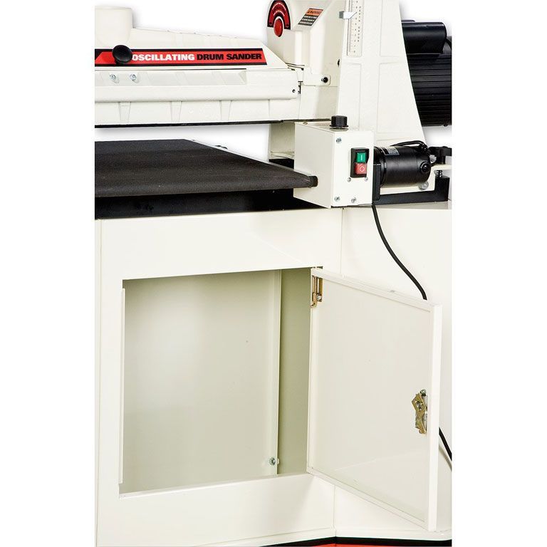 Jet 22-44 OSC осциллирующий барабанно-шлифовальный станок с автоматической подачей заготовки на транспортерной ленте. Основное назначение – шлифование и калибрование изделий из древесины. Модель поставляется в комплекте с тумбой-подставкой, оборудованной колесами и тормозом. Жёсткая конструкция с чугунными основанием и кронштейном крепления консоли обеспечивает высокую точность и повторяемость, что особенно важно в условиях поточного производства. Поскольку вал закреплен с одной стороны, можно шлифовать широкие детали в два прохода с поворотом. При работе с длинными заготовками желательно установить удлинения загрузочно-разгрузочного стола (арт.982202).