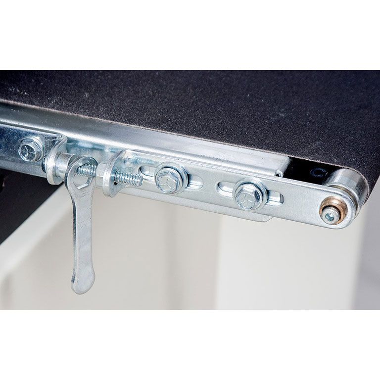Предусмотрены все необходимые настройки: высоты установки барабана (маховиком сверху) и скорости подачи (плавная при помощи электроники). Центровка ленты транспортера производится специальными винтами и обычно требуется только после замены. Основной расходный материал – абразивная лента шириной 75 мм, она наматывается на барабан, концы фиксируются в зажимах.
