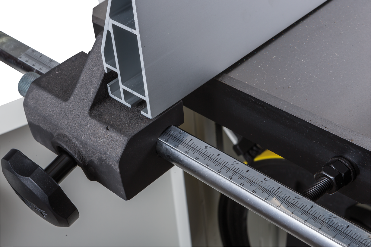 Jet JWBS-15 - ленточная пила нового поколения, предназначенная для профессионального использования. Ее основное преимущество, на фоне аналогов прошлых поколений, - увеличенная высота распиловки. Этот параметр очень важен для тех, кому нужен универсальный станок, способный взять на себя функции делительного. К подобным работам приспособлен и параллельный упор: направляющий профиль можно установить вертикально на боковую грань так, чтобы надежно фиксировать плоские заготовки при их роспуске на тонкие пластины. В целом конструкция бокового упора очень хорошо проработана и соответствует самым строгим требованиям: профиль жесткий и прочный, закреплен на массивном чугунном кронштейне, который перемещается по цилиндрической направляющей. Предусмотрена грубая (вручную) и точная (микрометрическим винтом) установка.