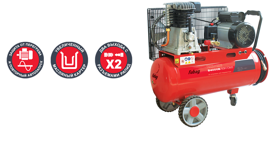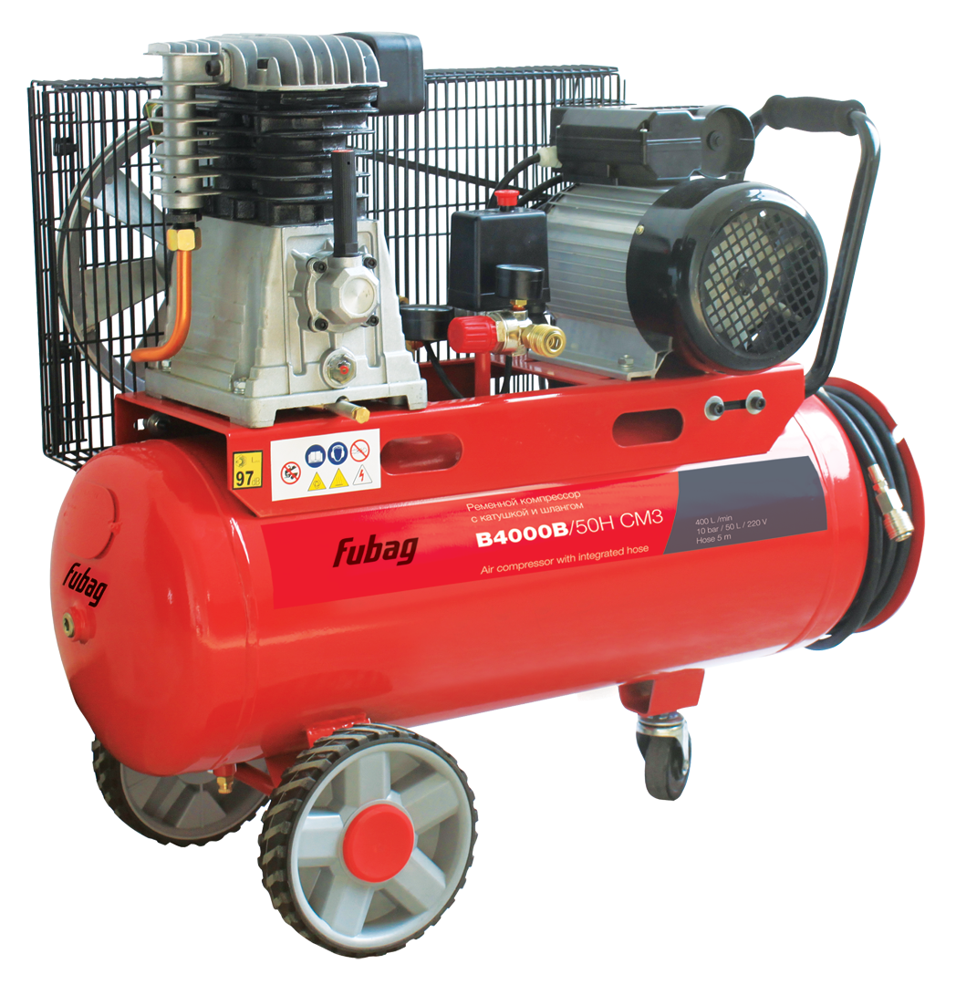 Поршневой масляный ременной одноступенчатый компрессор Fubag B4000B/50H CM3 с катушкой и шлангом рекомендован для всех видов работ на небольших производствах, в мастерских, в строительстве и гаражном хозяйстве.