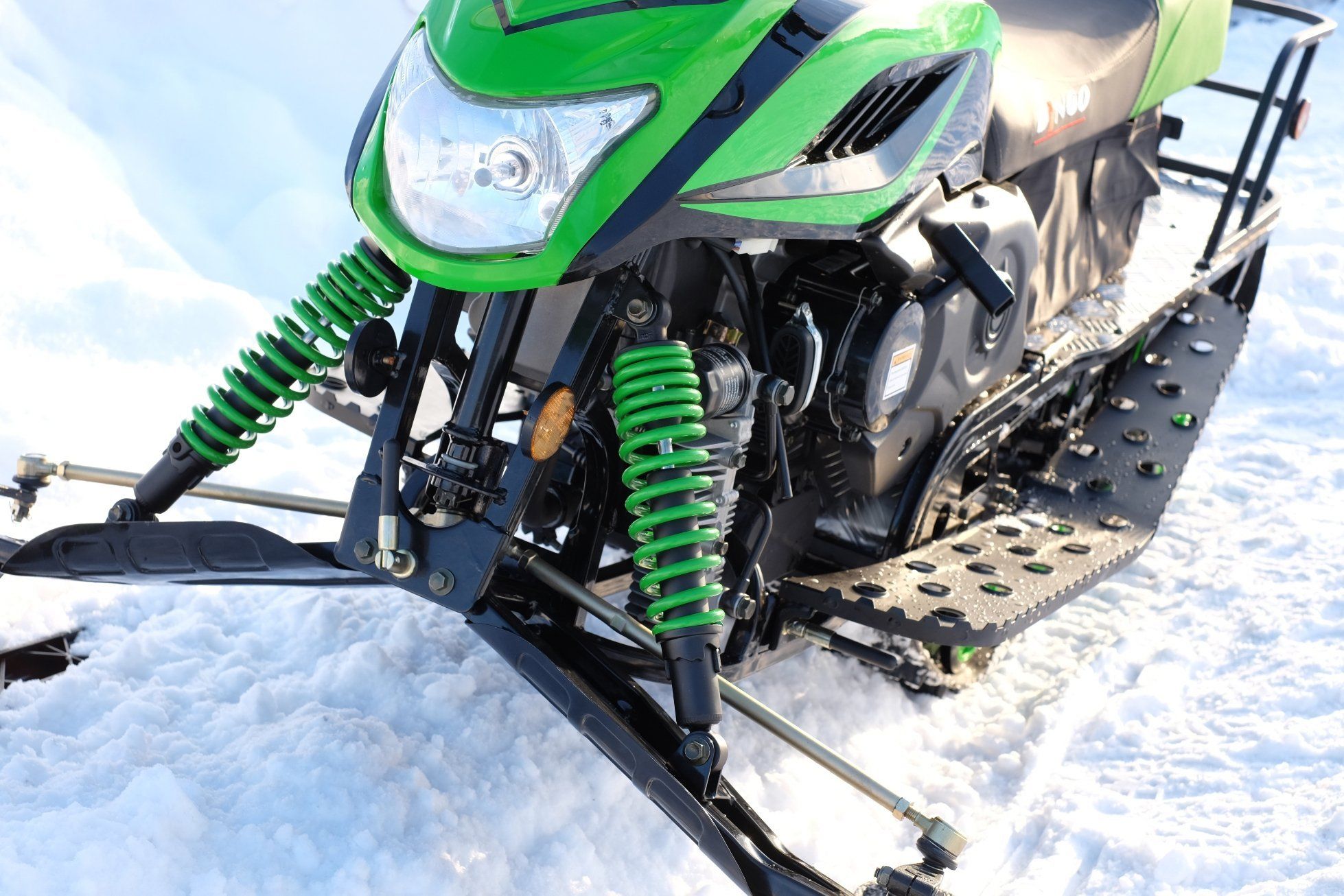 Не осталась без внимания и ходовая часть снегохода Dingo T150 – гусеница снегохода была удлинена до 2 626 мм., грунтозацеп увеличен до 23 мм., а принципиально новая, катково-склизовая подвеска с двумя амортизаторами обеспечивают снегоходу отличную проходимость!