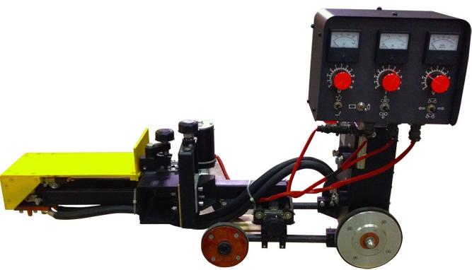 - К передней части тележки присоединен крестообразный суппорт для установки положения электродной проволоки относительно шва и регулировки вылета электродной проволоки. К крестообразному суппорту присоединена сварочная головка.