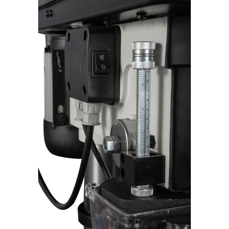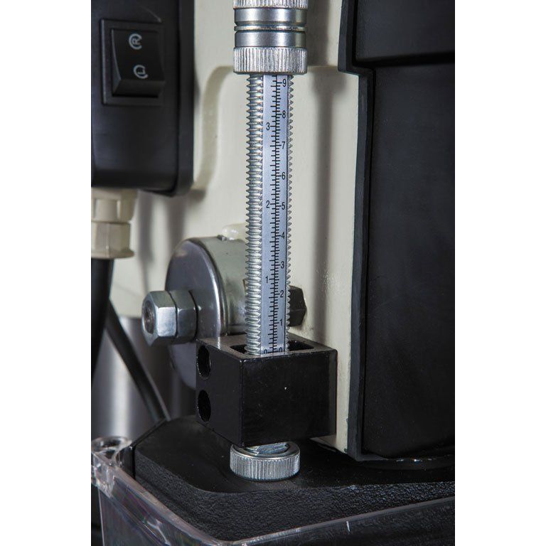 Станок укомплектован чугунным столом, регулируемым по высоте и по углу установки. Сверлильная часть тоже выполнена из чугунного литья. Для контроля глубины сверления предусмотрена шкала с миллиметровой и дюймовой разметкой, а также регулируемый ограничитель. Скорость вращения шпинделя меняется в широких пределах перестановкой ремней в редукторе (он имеет две ступени).